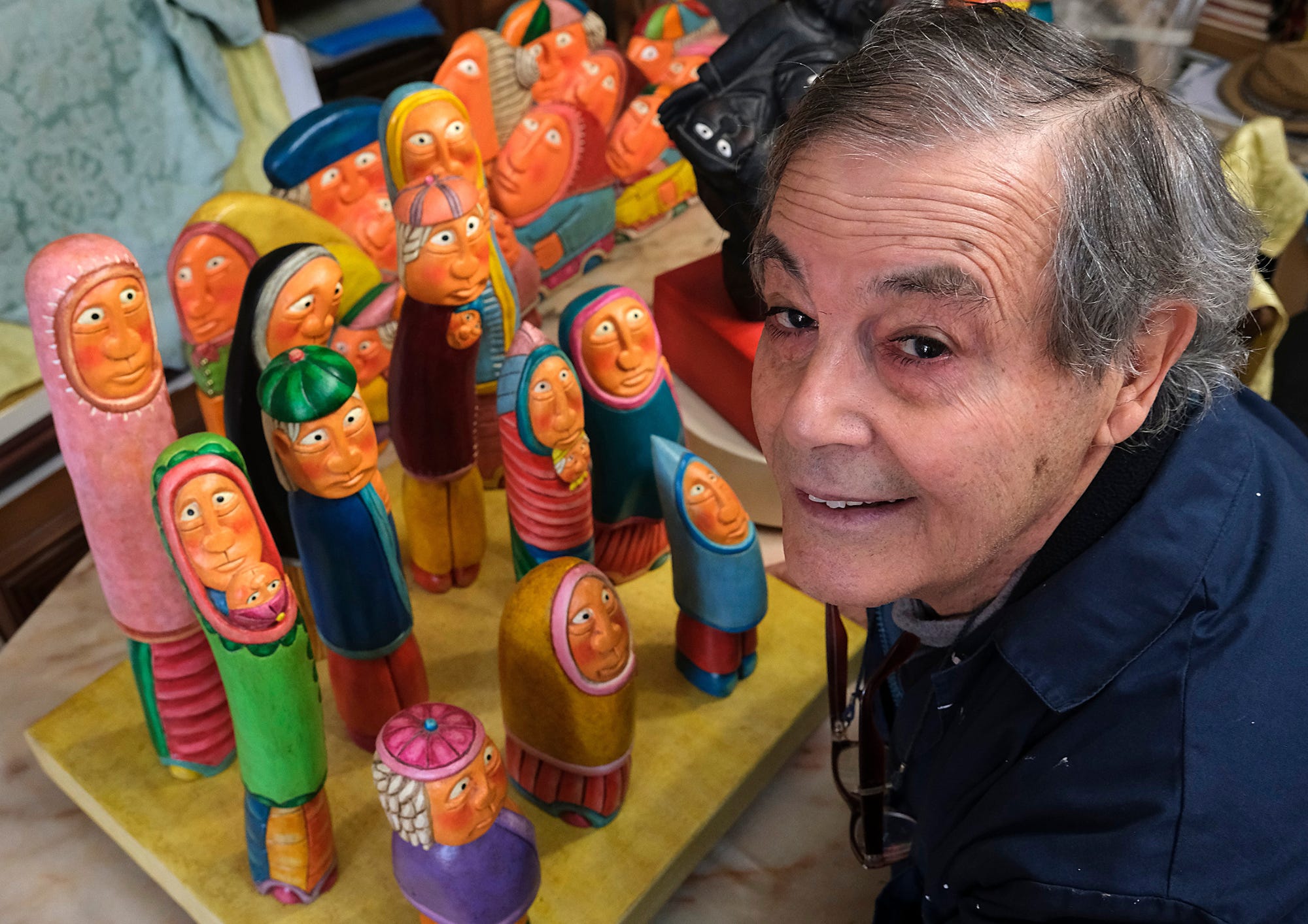 Intorno a queste figure prendono vita uomini, donne, bambini e animali, goffi e teneri, poggiati su curve morbide che sembrano muoversi, pregare, attendere, condividere.